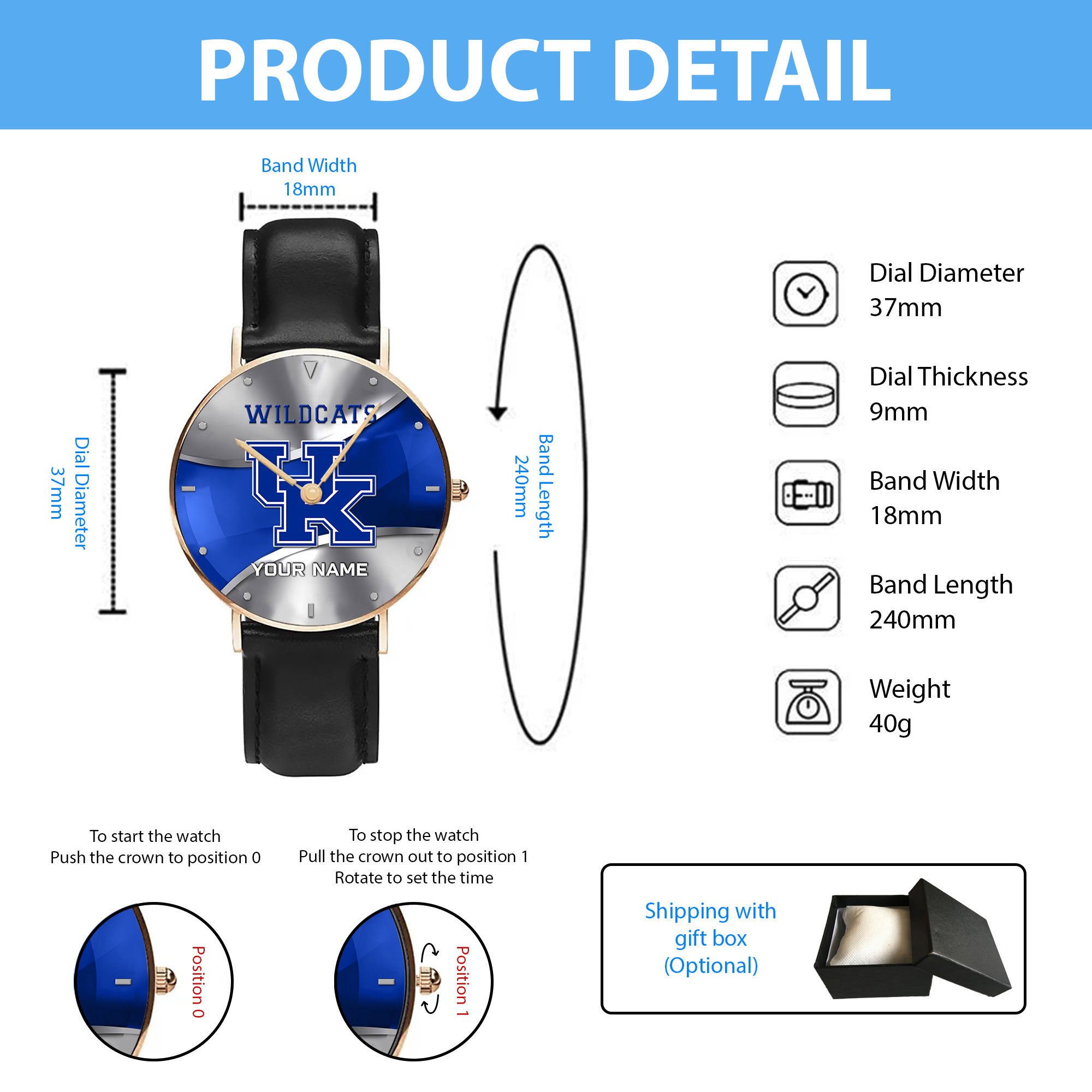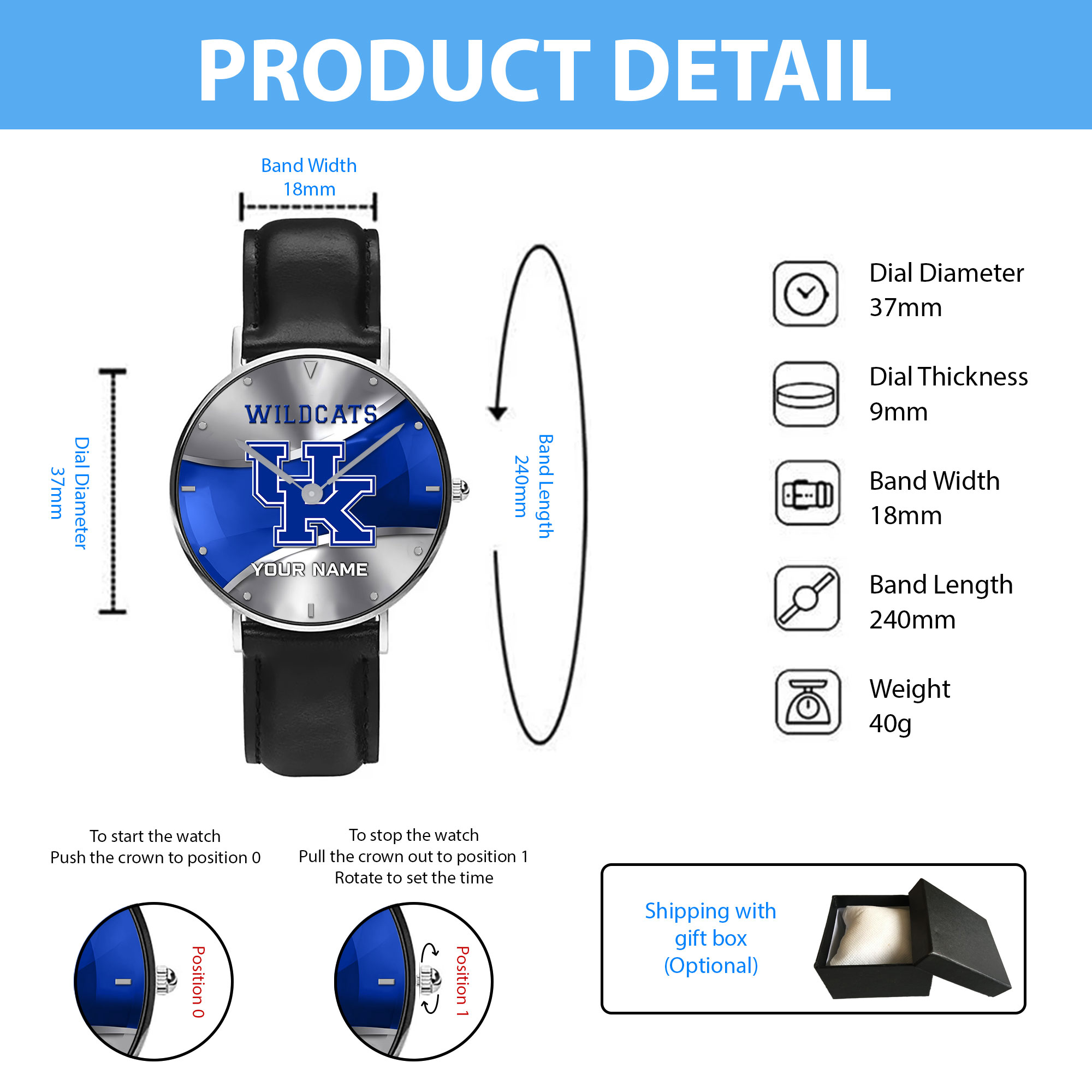 ZNCAA Kentucky Wildcats – Football Black Stitched Leather Watch – Custom Name