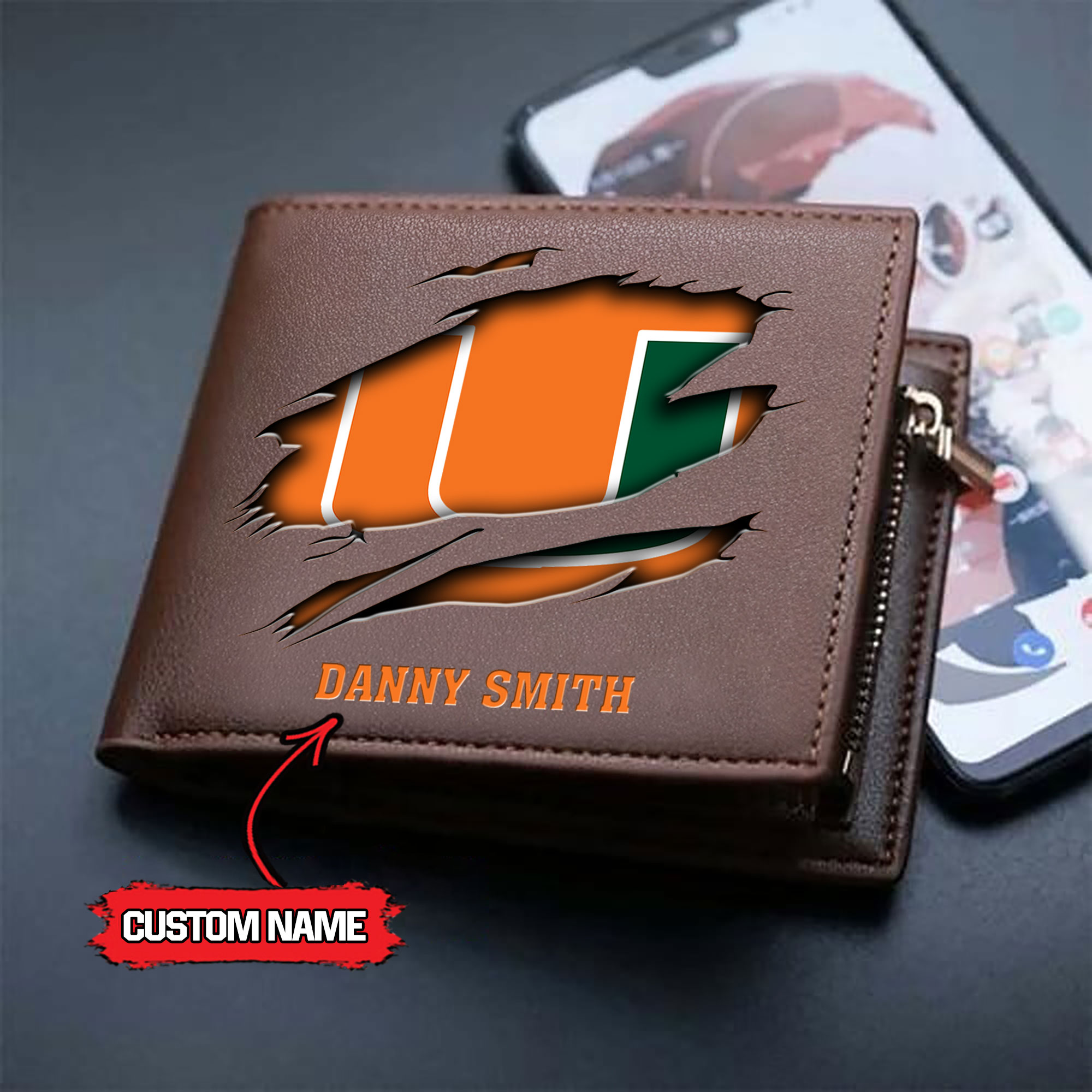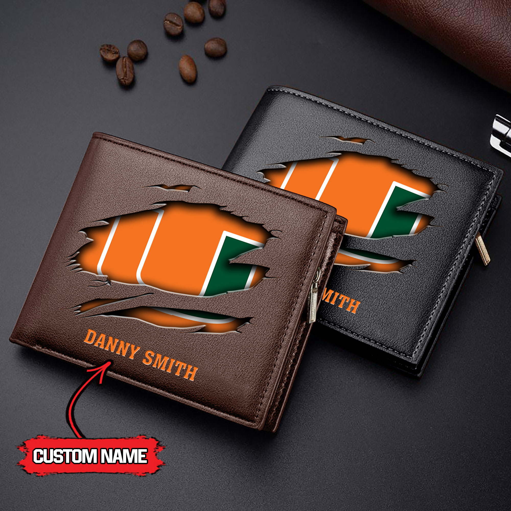 ZNCAA Miami Hurricanes – Men’s Leather Wallet – Custom Name