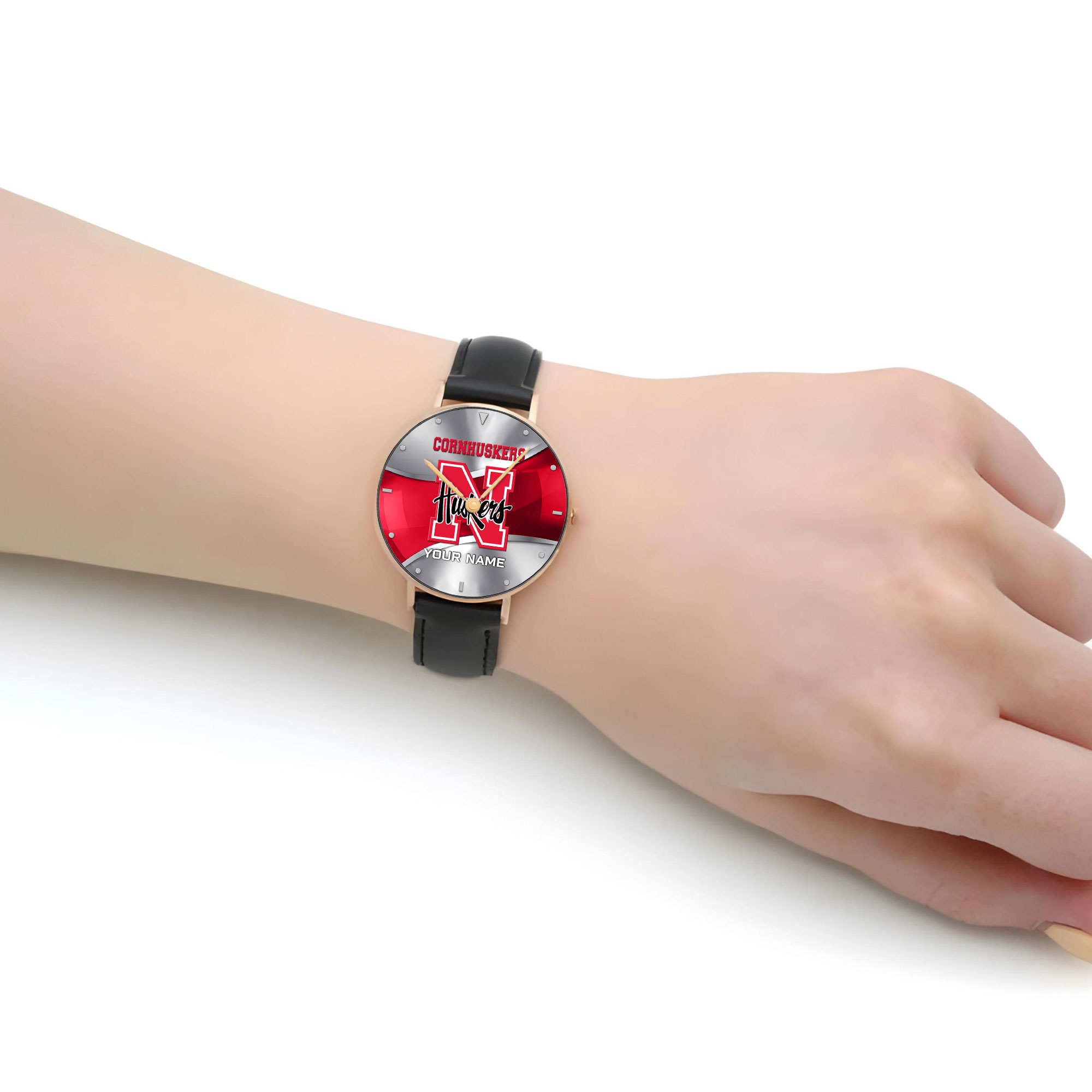 ZNCAA Nebraska Cornhuskers – Football Black Stitched Leather Watch – Custom Name