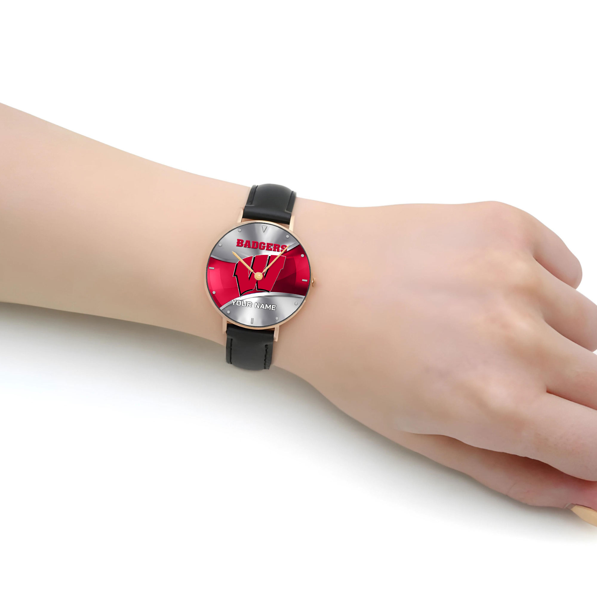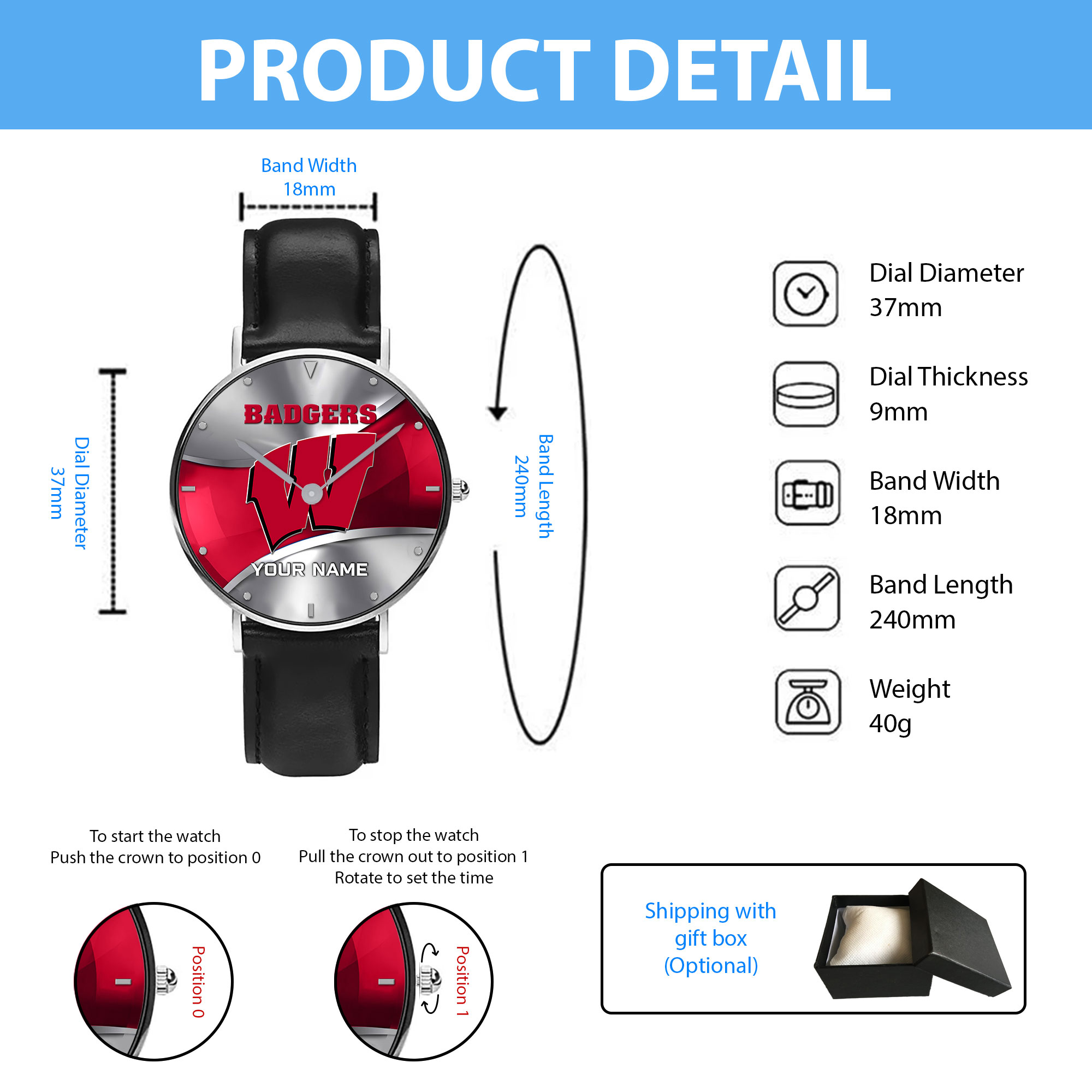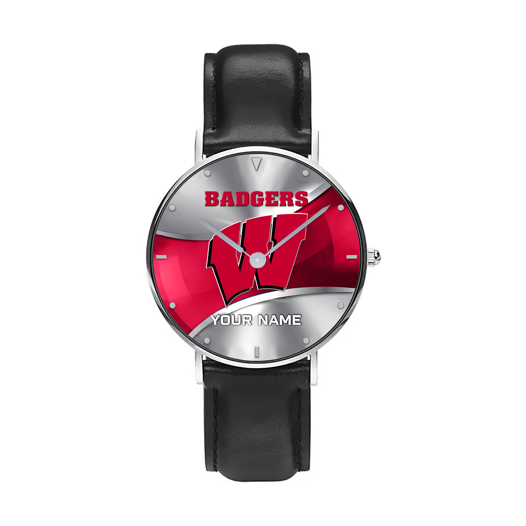 ZNCAA Wisconsin Badgers – Football Black Stitched Leather Watch – Custom Name